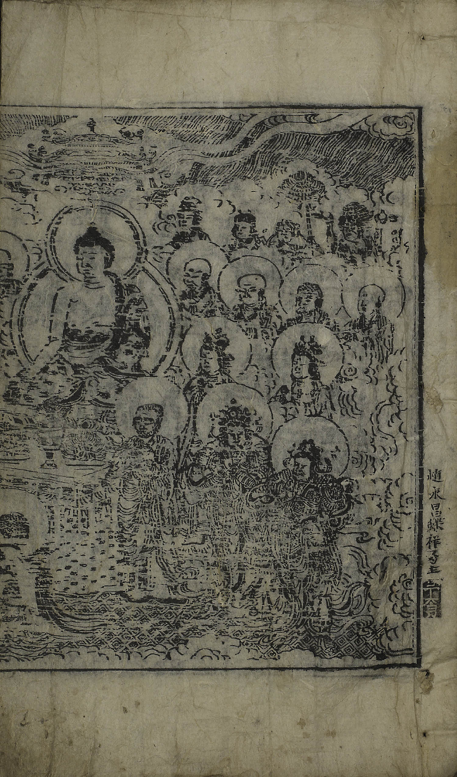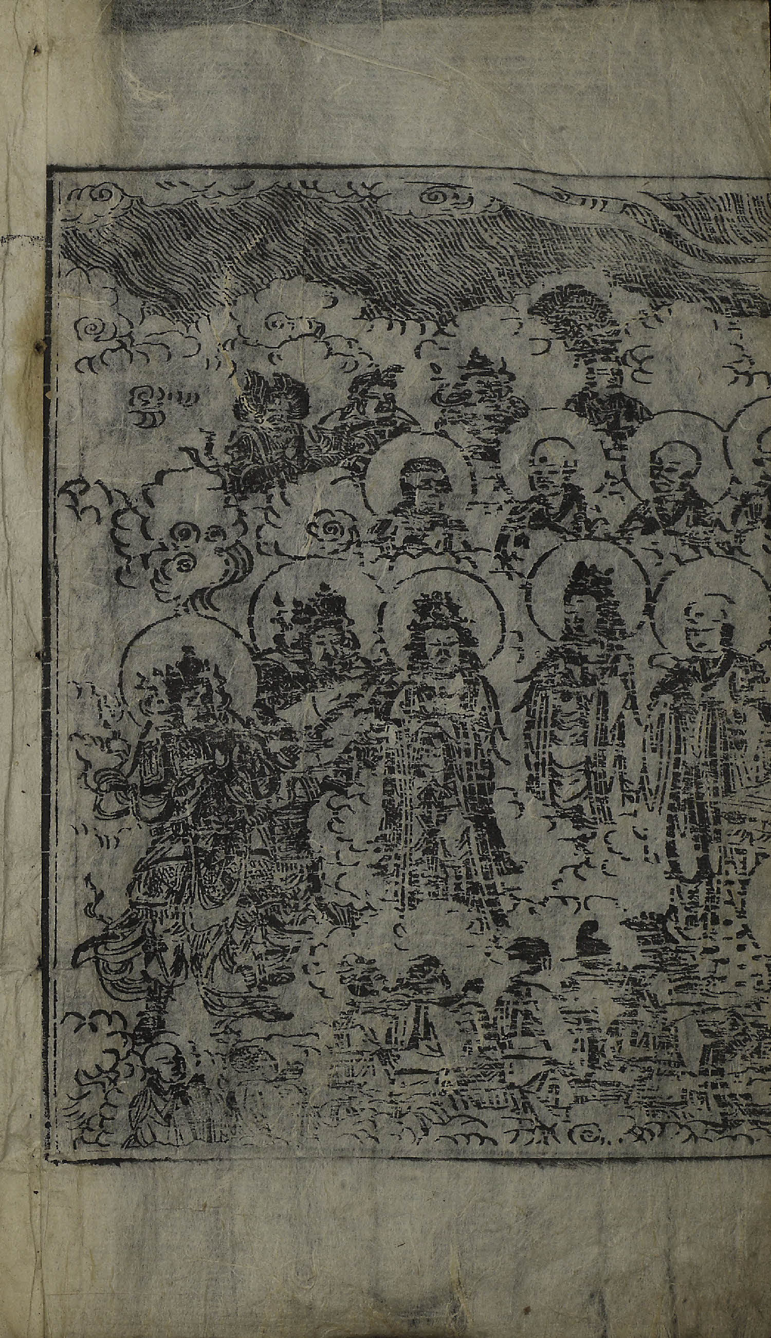 卷1(全7卷), 變相, 四周單邊 半郭 24.0×16.1 cm , 無界, 10行18字, 白口, 上下下向2葉花紋魚尾(黑魚尾 混入) ; 36.5×22.0 cm.