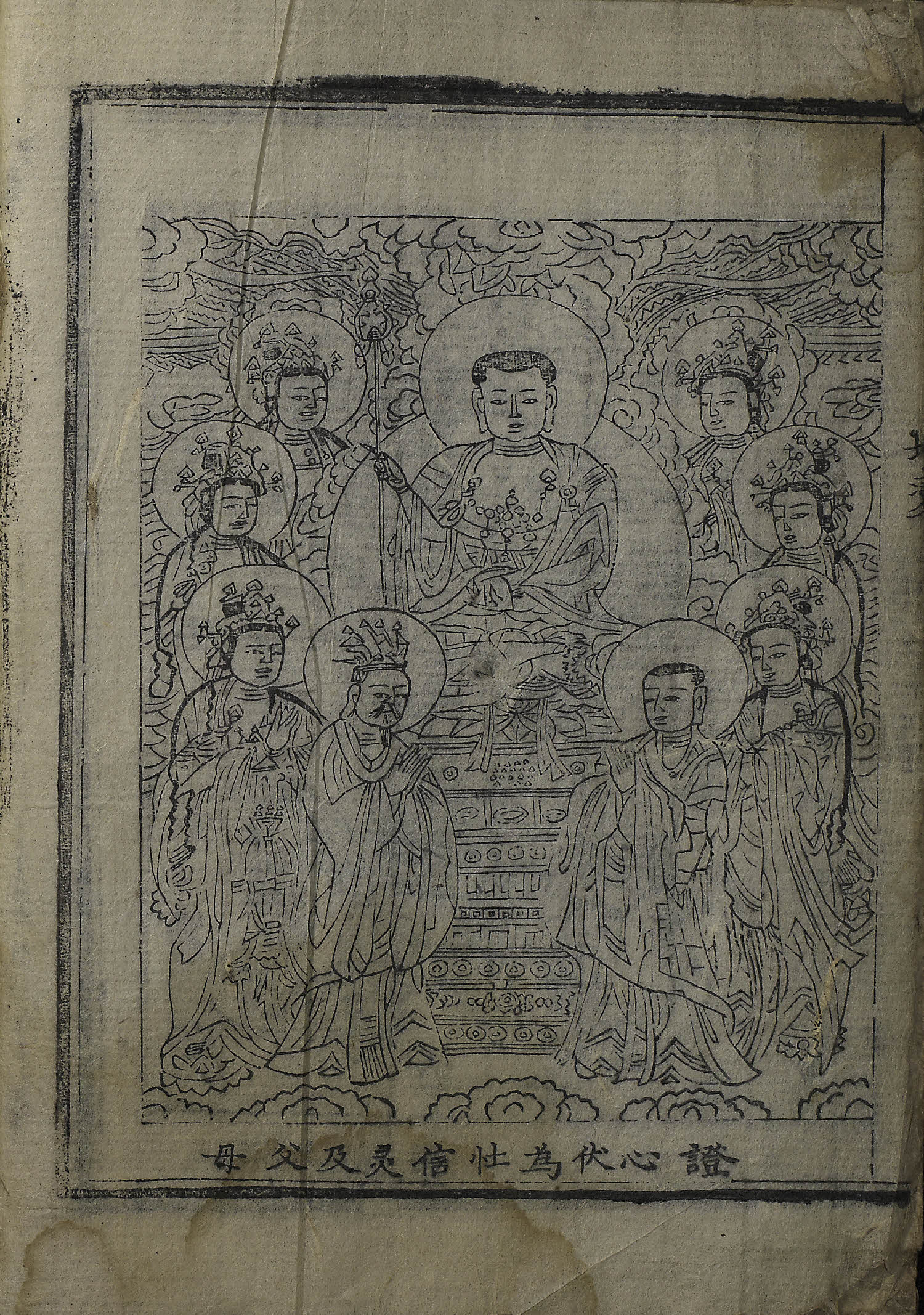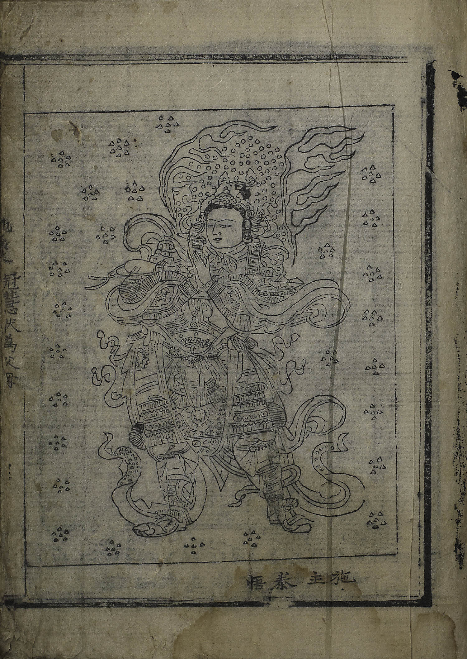 - 54張(張數: 地藏經變相: 1張 / 七星佛圖: 3張 / 七星符: 2張 / 太上玄靈北斗本命延生眞經: 16張 / 天地八陽經密傳, 天地八陽神呪經序, 佛說天地八陽神呪經: 27張 / 佛說竈王經: 4張 / 施主秩: 1張), 變相 / 圖像, 四周單邊 半郭 20.0×15.3 cm , 有界, 行字數不定, 白口, 上下內向2葉花紋魚尾(白魚尾, 黑魚尾 混入) ; 27.0×20.9 cm.