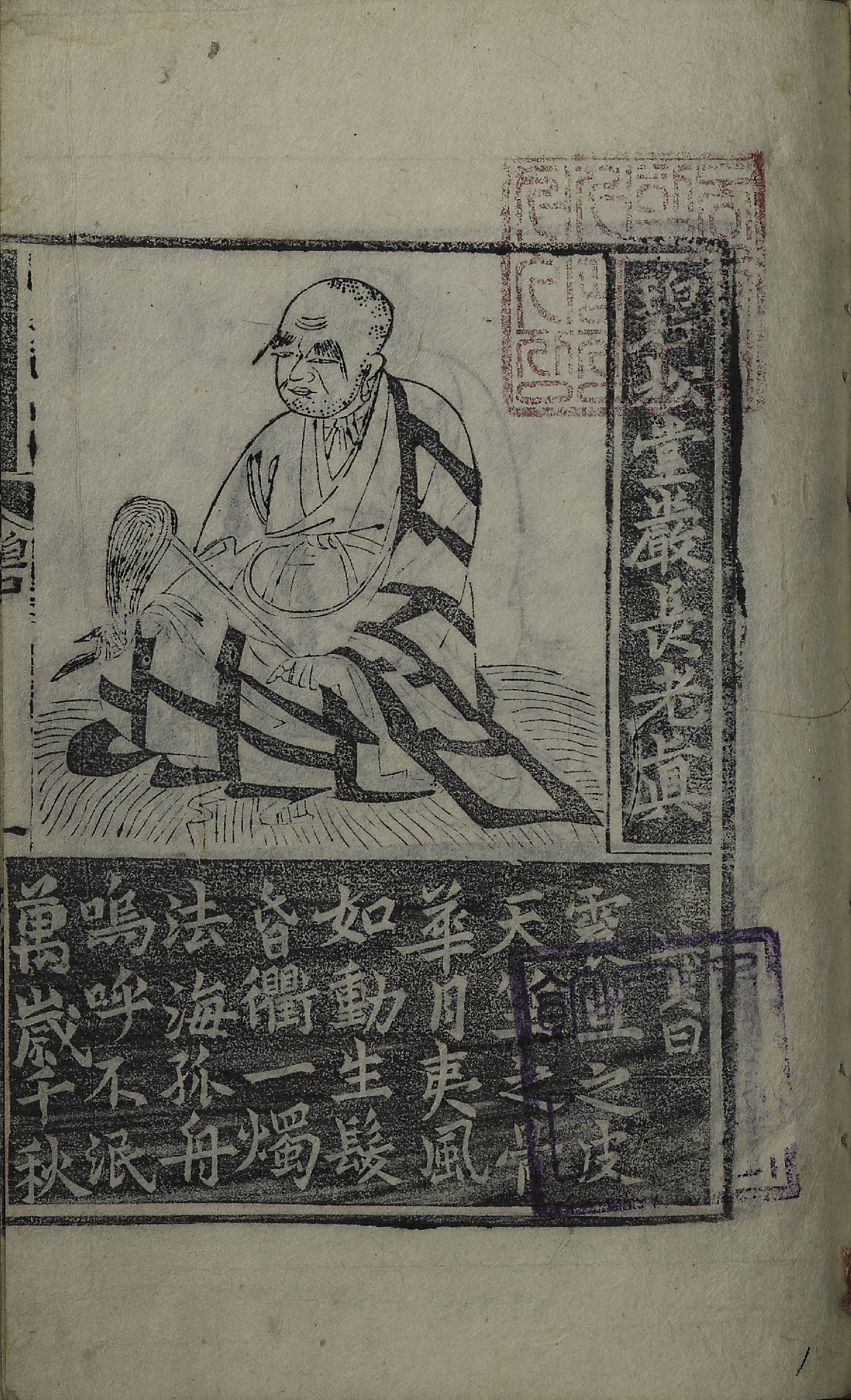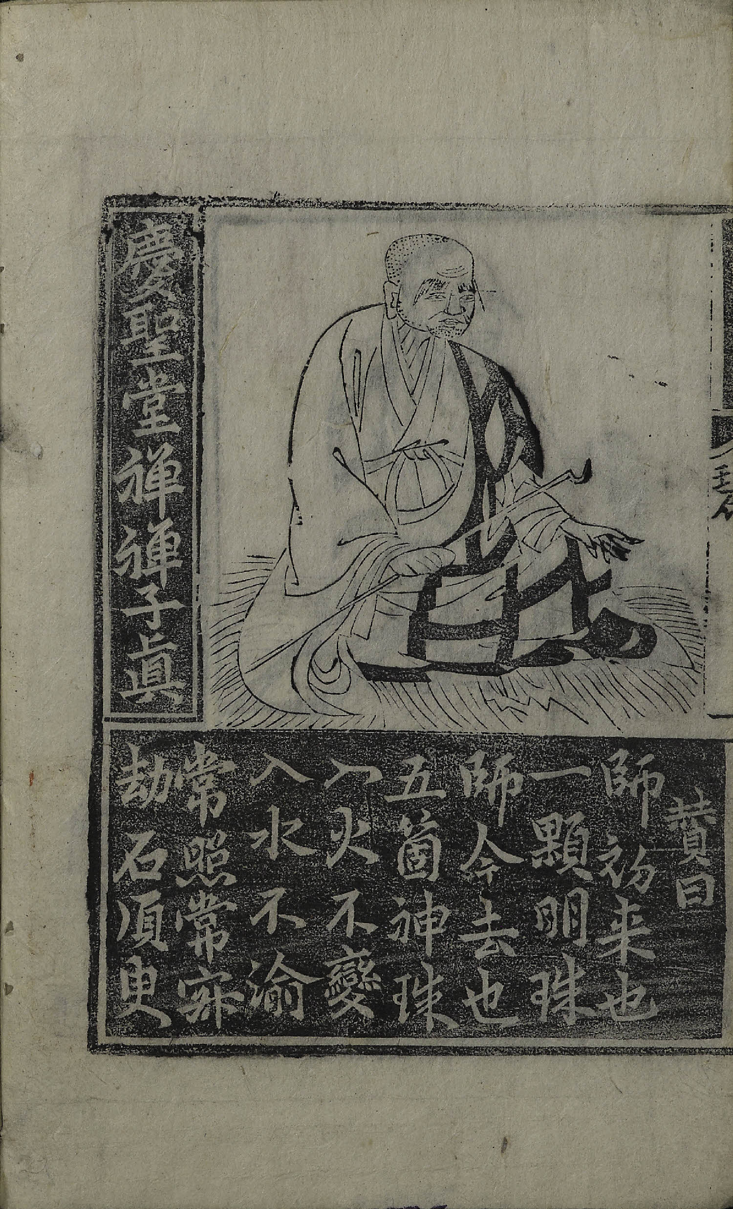 38張, 圖像, 四周單邊 半郭 17.5×12.5 cm , 無界, 6行8字, 上下黑口, 上下內向黑魚尾 ; 25.8×17.1 cm.