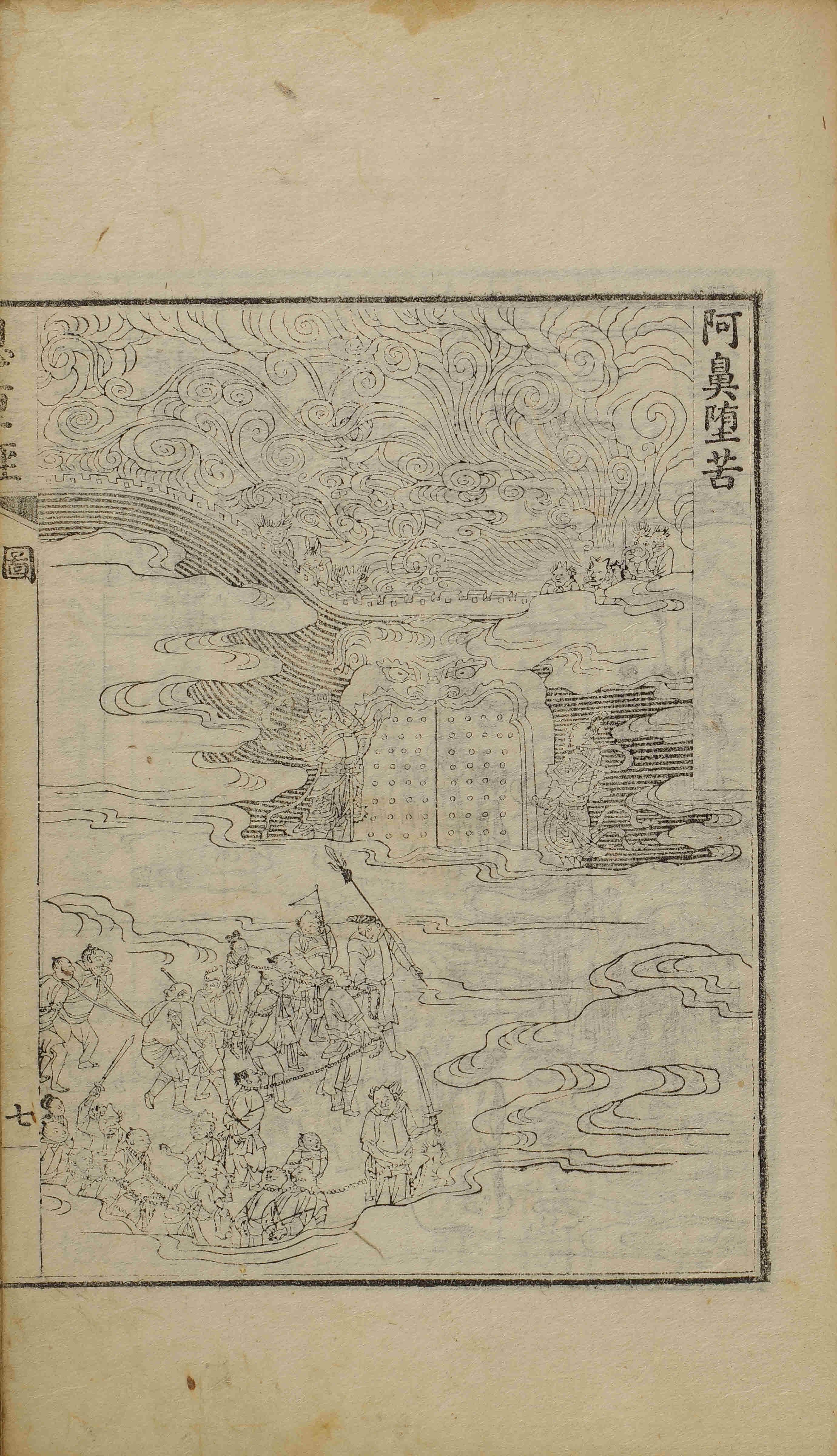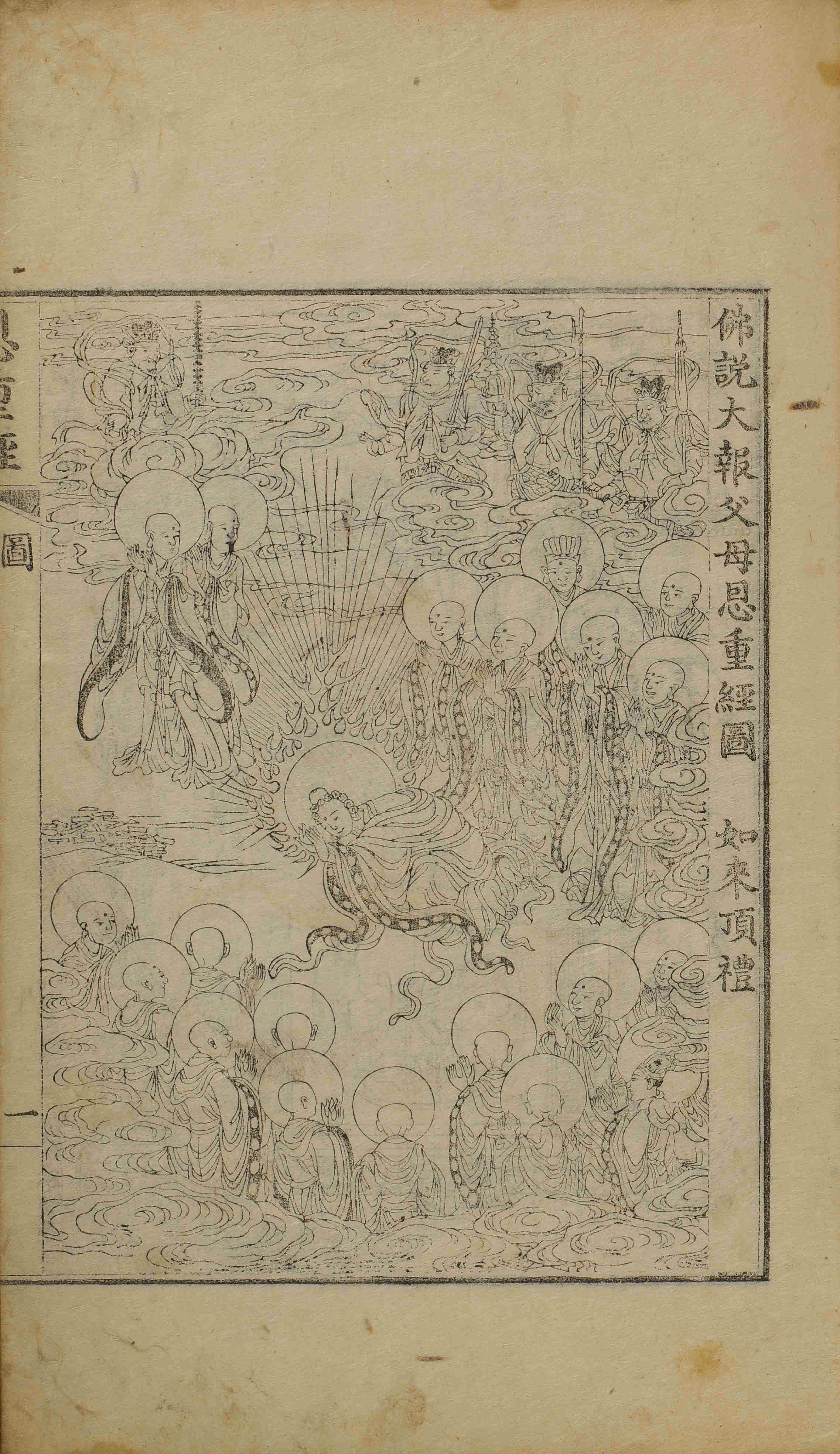 - 31張(科判: 張次 第1-2張 / 圖像: 張次 第1-7張 / 恩重經: 張次 第1-22張), 圖像, 四周雙邊 半郭 22.3×16.1 cm , 有界, 8行16字, 上花口('恩重經' 陽刻)下白口, 上下向黑魚尾 ; 32.5×20.7 cm.
