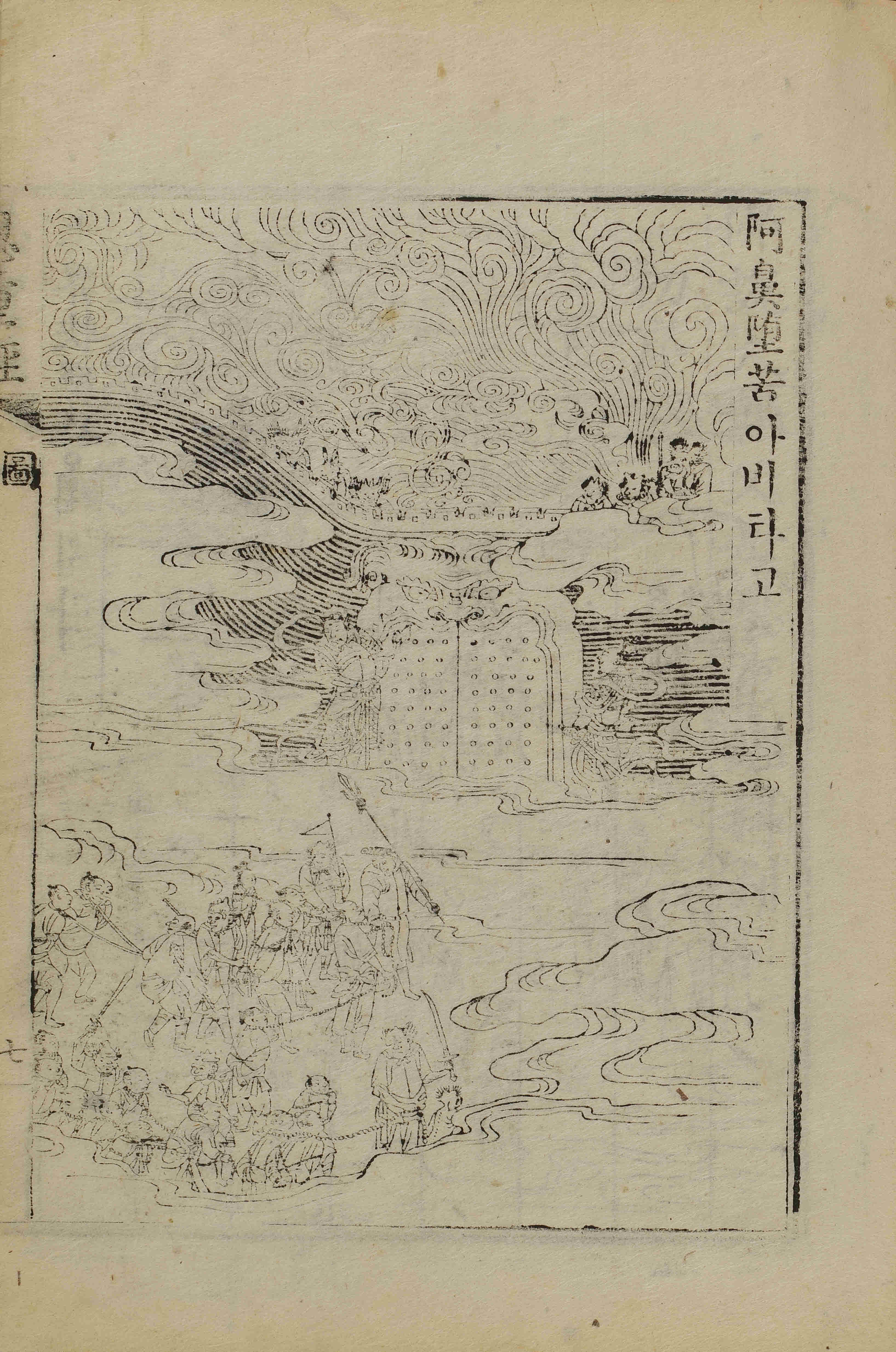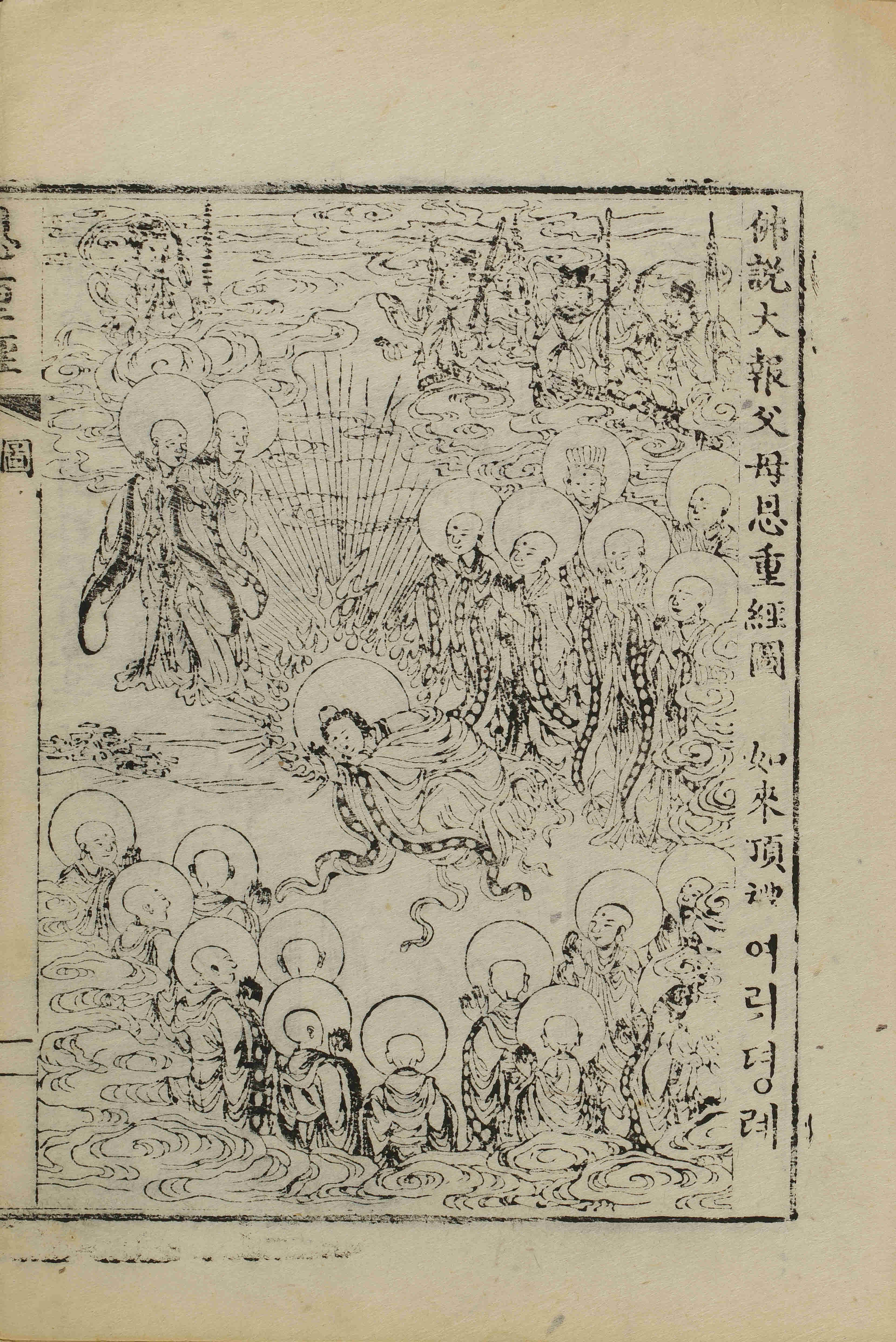 - 80張(圖像: 張次 第1-7張 / 科判: 張次 第1-2張 / 恩重經: 張次 第1-22張/ 불셜대보부모은듕경: 張次 第1-49張), 圖像, 四周雙邊 半郭 22.2×16.3 cm , 有界, 8行16字, 上花口('恩重經' 陽刻)下白口, 上下向黑魚尾 ; 29.1×21.7 cm.
