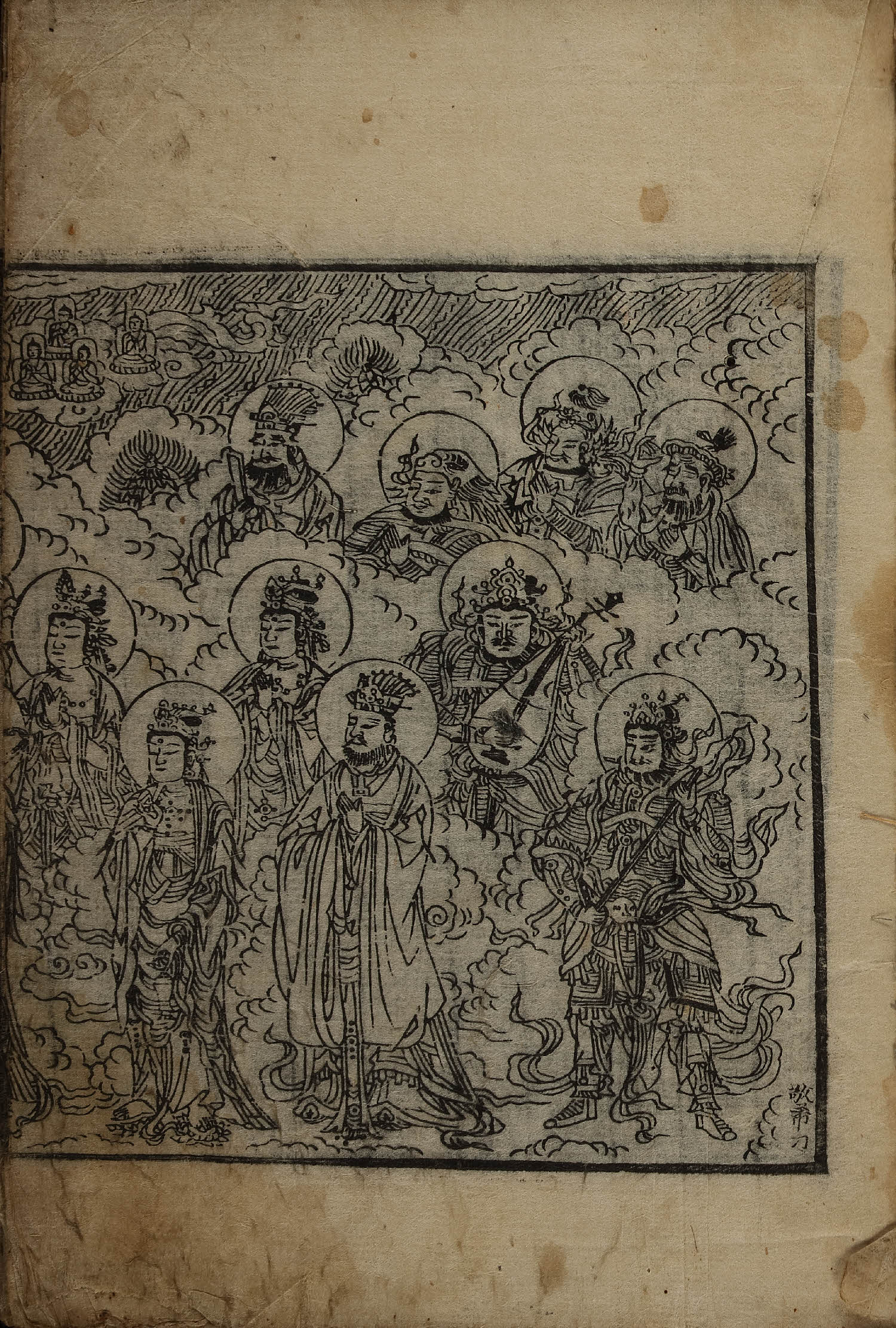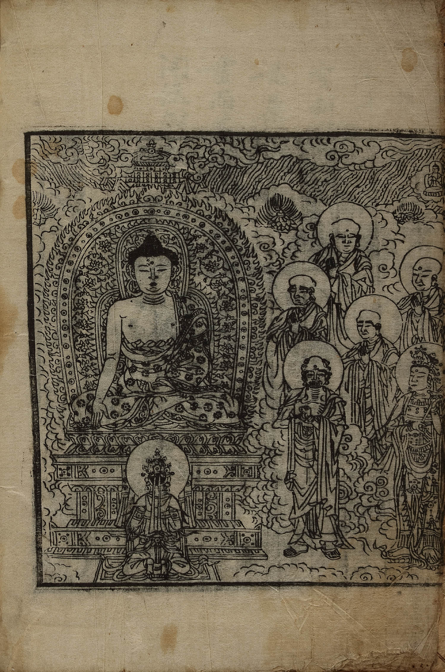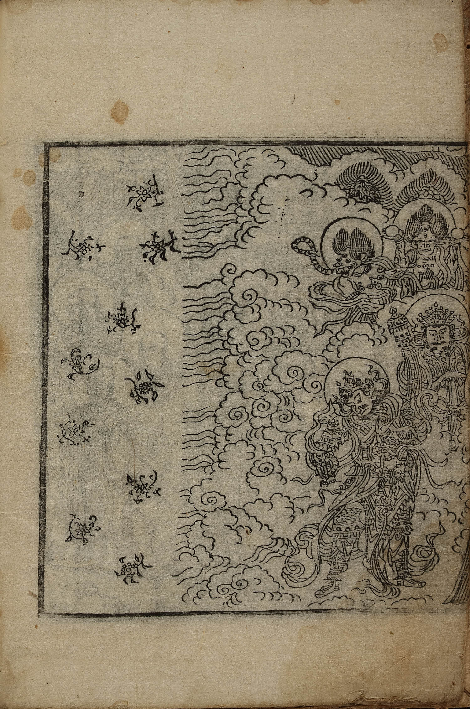 - 卷1, 變相, 四周單邊 半郭 21.1×18.2 cm , 有界, 9行 大字17字 小字雙行17字 低1字中字16字 低1字小字雙行15-16字, 黑口(下花口('人'字 등 陰刻) 混入), 內向黑魚尾(內向2葉花紋魚尾 混入) ; 31.6×22.7 cm.