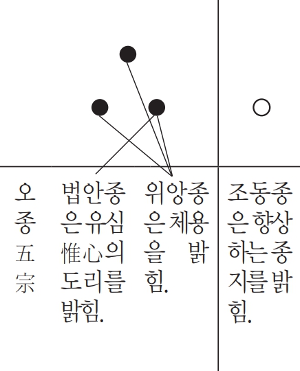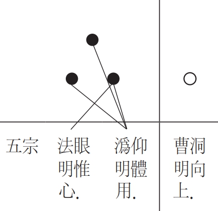 - 319)『禪文手鏡』(H10, 519a), “一法眼宗明唯心 偏明本分一句 ;二潙仰宗明體用 圓明今本三句 ;三曹洞宗明向上 超出今本三句 ;四雲門宗明截斷 多明大用直截 ;五臨濟宗明機用 具明三要 .”