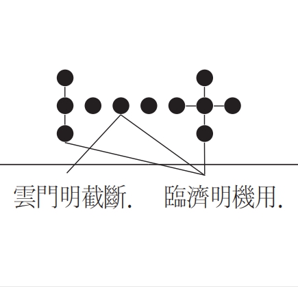 b10), “ ‘몇 번째 기틀인가?’라고 한 말:대체로 학인을 가르침에는 세 등급 기틀 중 한 기틀을 쓰고, 온전한 기틀을 그대로 드러내는 일은 벌이지 않는다. 구절로 보면 세 등급 속에 모두 삼구가 들어 있다. 삼구란 인人과 경境이 그것이다. 그러므로 곧바로 상근기를 가르치며 제1기에서 들어 보이면 구절마다 하나하나에 온전히 제기되어 있다. 온전히 제기되어 있다면 ‘삼구를 벗어난 일구’나 ‘일구에 삼구가 모두 갖추어진다.’거나 ‘삼구가 일구에 귀착된다.’거나 ‘삼구와 일구가 서로 간섭하지 않는다.’거나 하는 따위의 주장이 모두 군더더기 말에 불과하여 어느 것도 특별한 사안에 속하지 않는다. 그러므로 사실은 두 구절에 불과하며 중간 구절이라는 말도 아무 효력이 없다.……마지막에 ‘남산에서 구름이 일어나니 북산에서 비가 내린다.’라고 한 말:이 말로써 옛사람은 그렇게 적절한 소식을 전할 수 있게 되었던 까닭에 사람을 죽이는 칼과 사람을 살리는 검에 대해서만 말했을 뿐이다. 그러므로 ‘한 줄의 끈 縚의 음은 刀 은 30푼 나간다.’라는 말은 ‘남산에서 구름이 일어나니 북산에서 비가 내린다.’라고 한 말보다 못하다. 어쩔 수 없이 중근기를 위해 제2기에서 시설하면 격칙格則을 완성한다. 체體와 용用의 구절을 예로 들면 체 안에 용이 있고 용 안에 체가 있다. 또한 중간구를 따르면 체와 용을 함께 거두고(收) 체와 용을 함께 놓아두지만(放), 사실은 삼구를 벗어나지 못한다. 비록 격칙을 벗어나지 못하지만 삼구를 한꺼번에 시설한다. 하열한 근기에게 자세하게 가르쳐 주고자 제3기 중에서 가르침을 주니, 수많은 차별과 지위를 시설하지만 그것도 삼구에서 벗어나지는 못한다. 그러므로 ‘이는 몇 번째 기틀인가?’라고 물었던 것이다.(第幾機者, 大凡接人, 有三等機之機, 非全機機事也. 如句焉, 於三等中, 皆有三句. 三句者, 人境是也. 故直接上根, 向第一機提持, 則句句一一全提. 旣是全提, 則‘三句外一句’, ‘一句該三句’, ‘三句歸一句’, ‘三一不相涉’之論, 皆爲剩語, 非是別事也. 然則其實不過兩句, 所謂中間句者, 亦無所得力矣.……下云南山起雲北山下雨者, 以此所以古人到這時節, 只道得个殺人刀活人釰. 然則‘一條縚 音刀 三十文’之言, 不如‘南山起雲北山下雨’也. 不得已爲中根, 向第二機施設, 則完成格則. 如體句用句, 體中有用, 用中有體. 且約中間, 體用雙收, 體用雙放, 其實亦不出三句. 雖然未離格則, 三句一時施設也. 曲爲下劣之根, 向第三機中接得, 則施設許多差別地位, 亦不離三句也. 故云, ‘是第幾機?’)” -